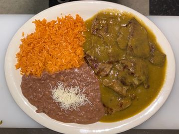 Thin cuts of beef skirt steak topped with our homemade green sauce. Tortillas, rice and beans.