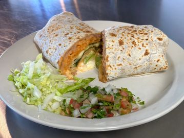 Chili relleno, beans, rice, sour cream and avocado wrapped in a large flour tortilla.