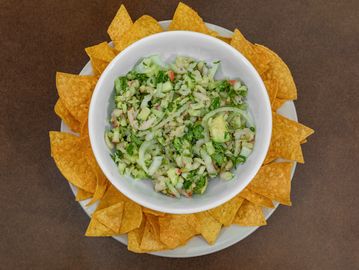 16 ounce container of red or green Ceviche with fresh cooked tortilla chips